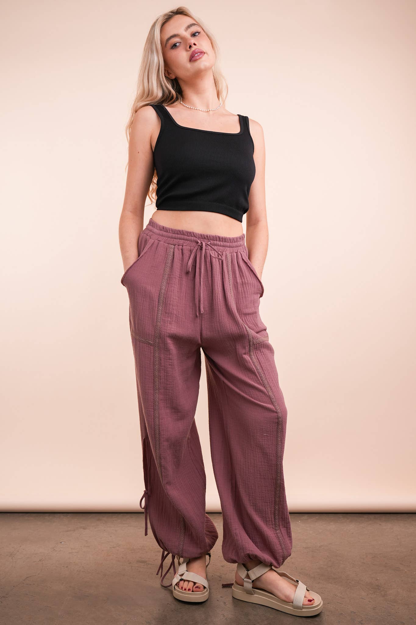 Side Tunnel Harem Pants with Lace Trim
