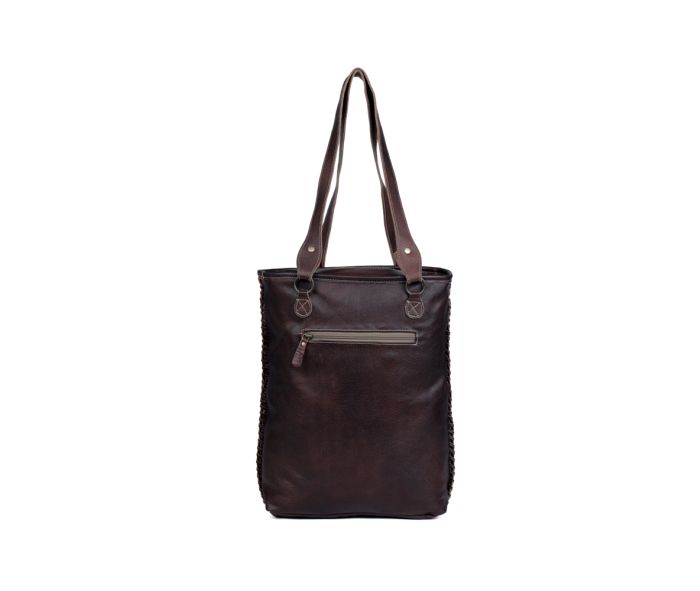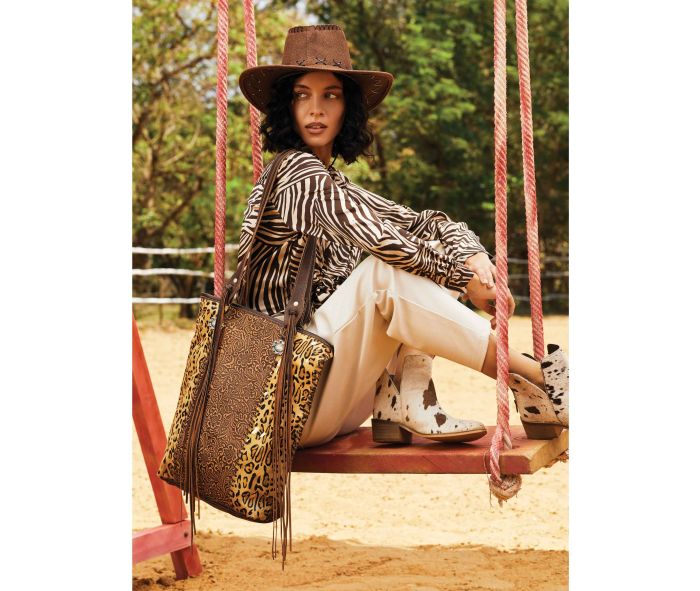 A whimsical combination of leopard print hairon and embossed leather forming an artistic harmony. The finishing touch is attained by south west hardware.