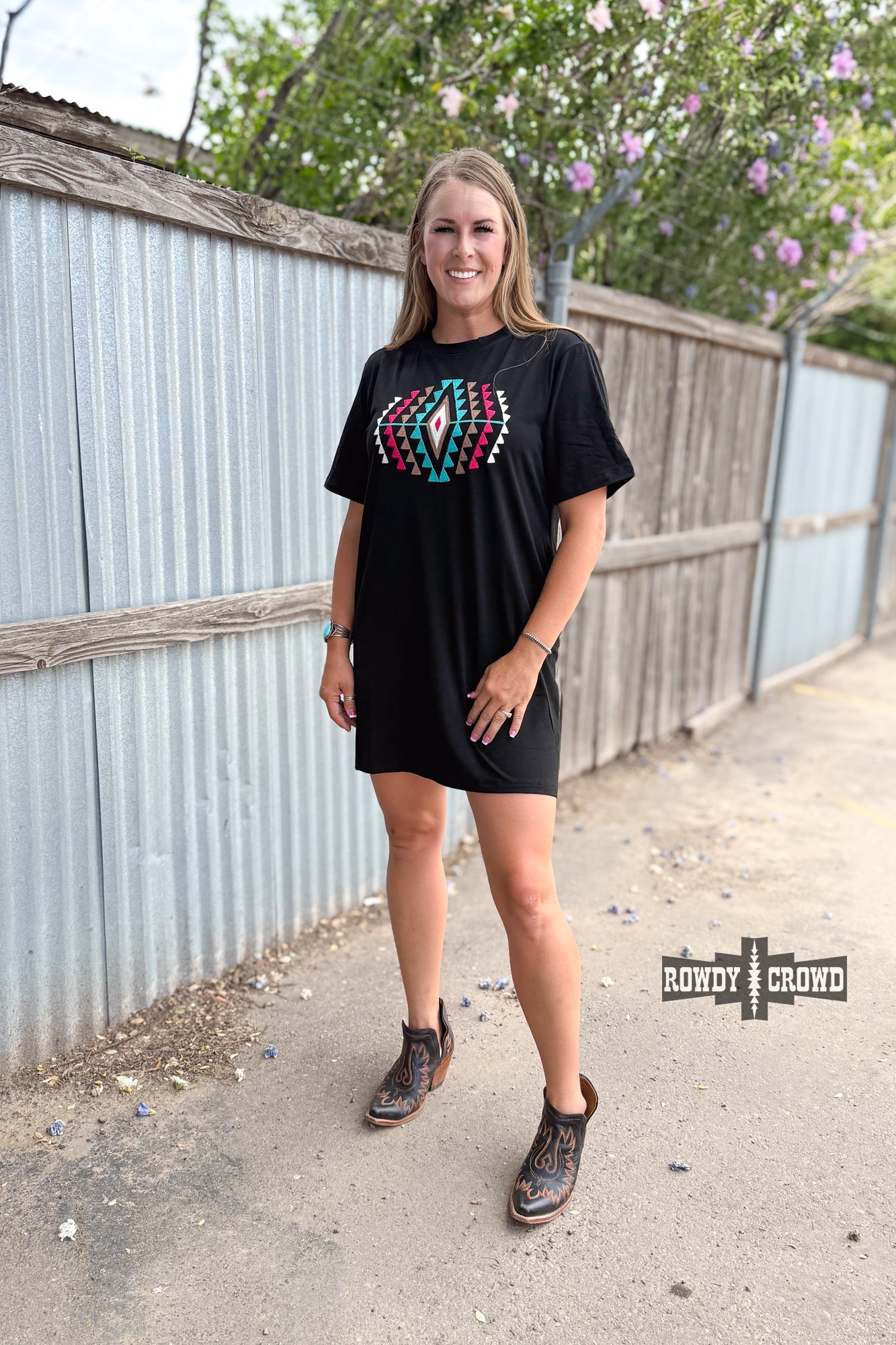 turn heads with the Desert Rose Dress! This t-shirt style dress has a knitted aztec design and can easily be paired with your favorite duster. Whether you're attending a concert or enjoying a casual day out, this dress adds a touch of western elegance to any occasion!
