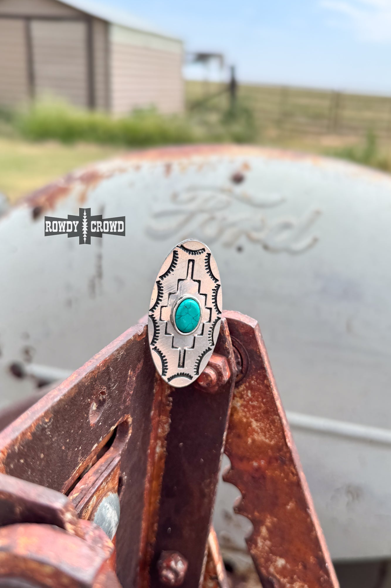 The Tough Luck Scarf Slide features a vibrant turquoise bead, surrounded by intricate Aztec-inspired stamping. Detailed silverwork along the edges adds texture and tradition, making it a bold, culturally rich accent for any Western look. You won't be S.O.L with this slide.